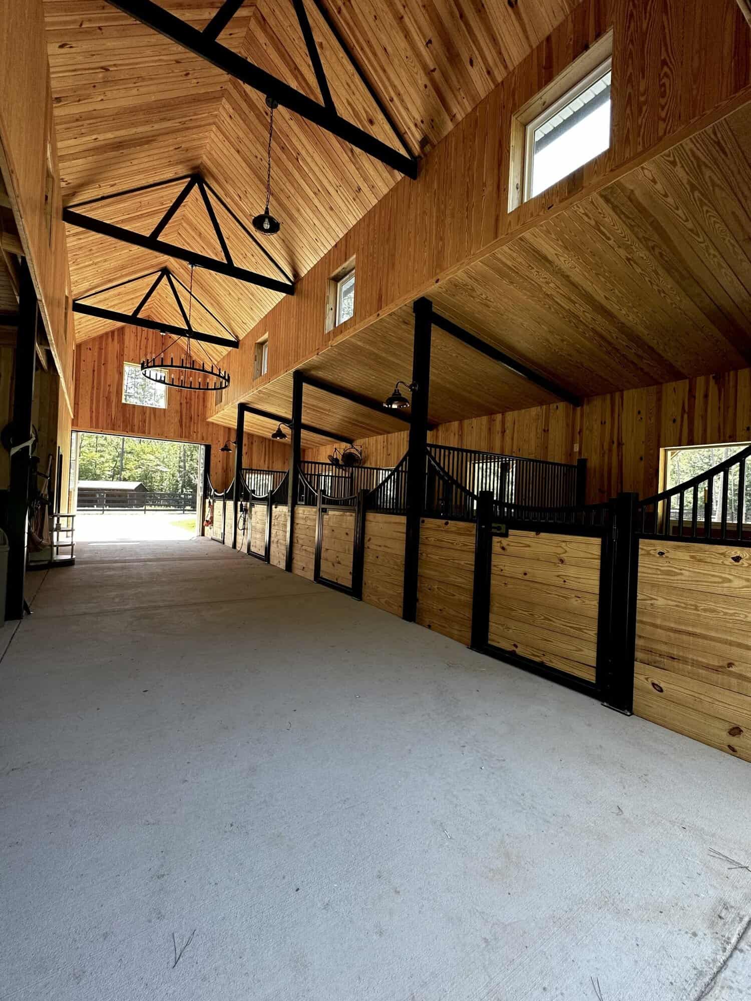 - Solid Black Stain: Used on stall walls, trusses, interior and exterior columns, and soffits to create rich contrast.
