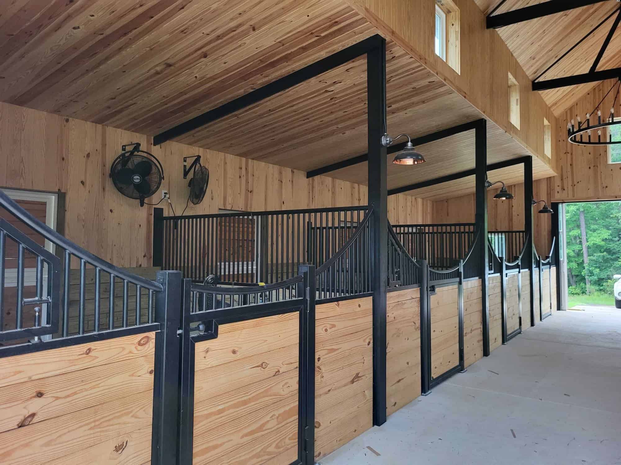- Solid Staining: Stained stall walls, trusses, columns, and exterior soffits with a bold black finish for dramatic contrast and added depth.