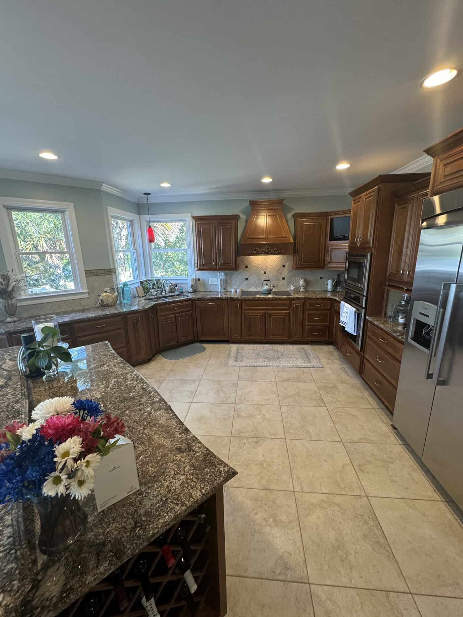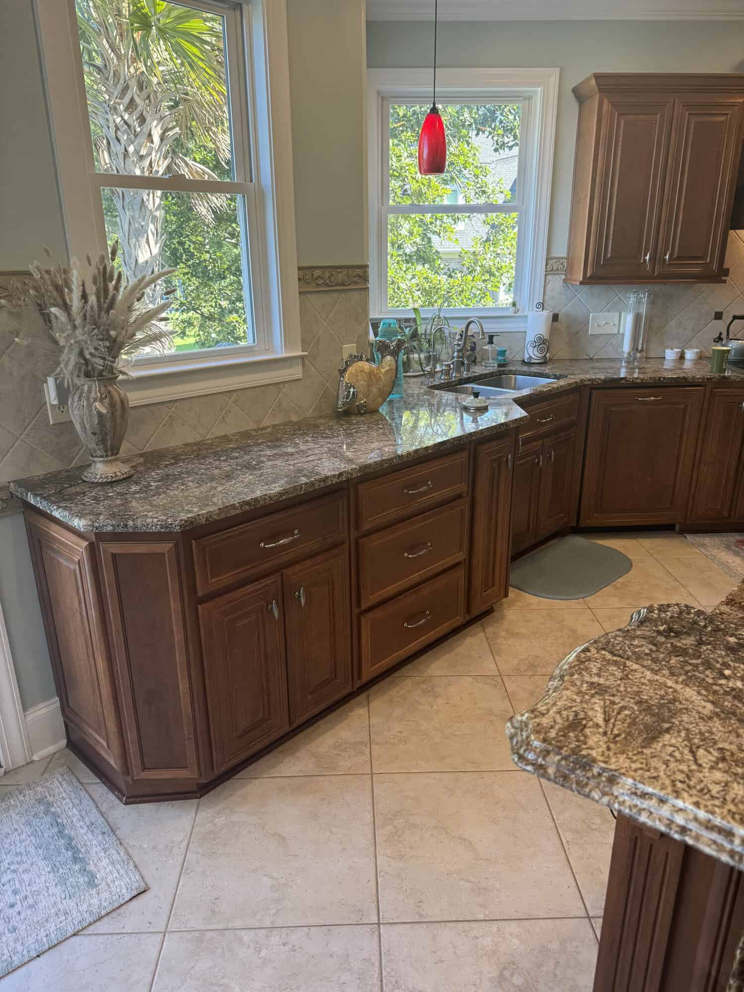 This residential kitchen cabinet refinishing project took place in a beautiful lakefront home on Lake Murray in Chapin, South Carolina. The space itself was generously sized, designed to be the heart of the home, but visually weighed down by dark cabinetry that no longer matched the homeowners’ vision.